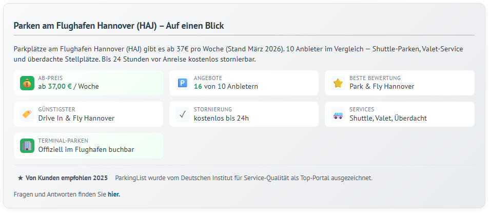 Ein Beispiel wird hier für die Parkplatzoptionen am Flughafen Hannover dargestellt: